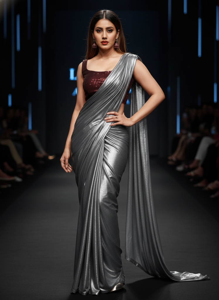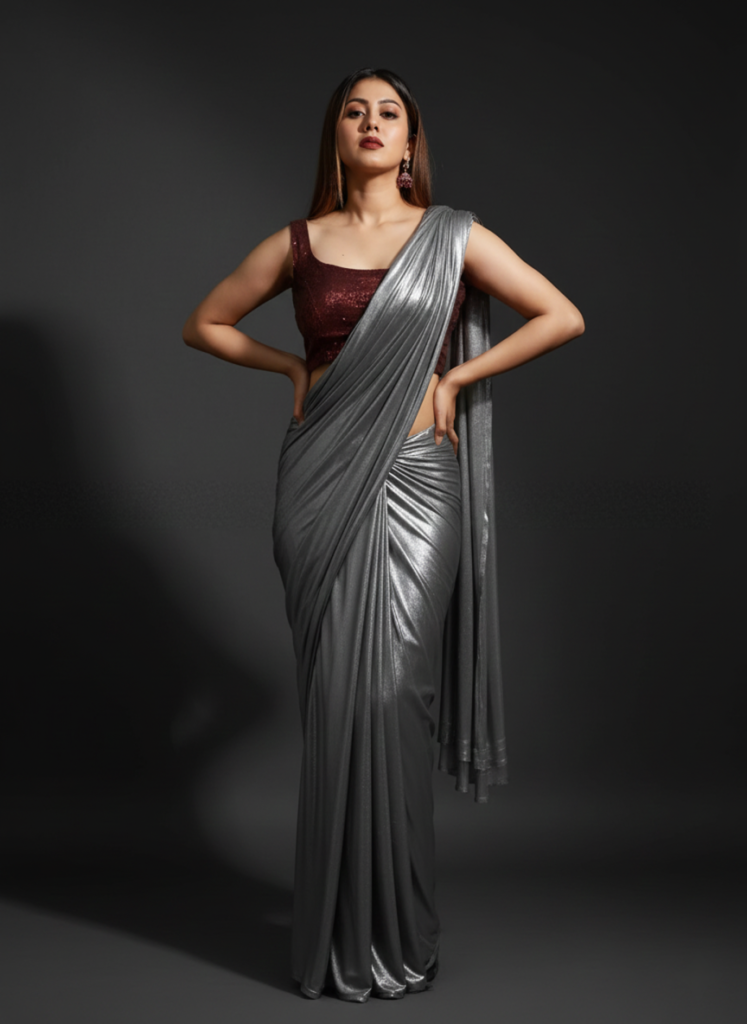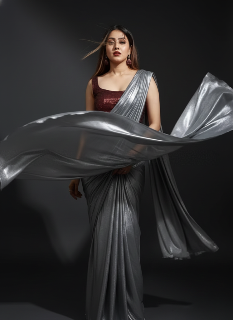 Stylish Design: Trendy silver grey saree with modern metallic finish