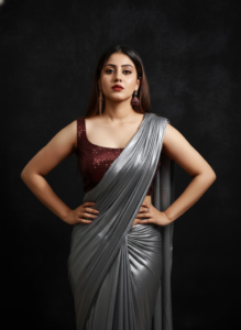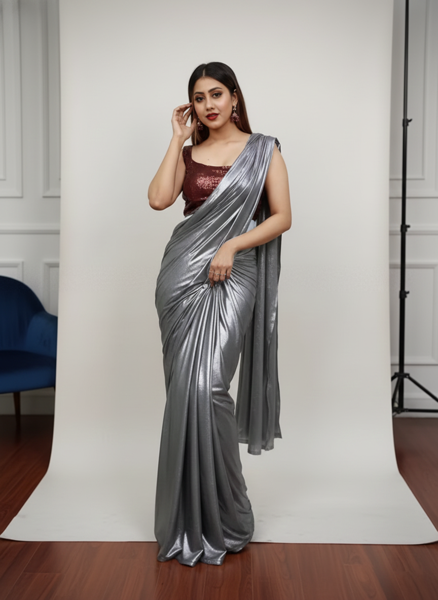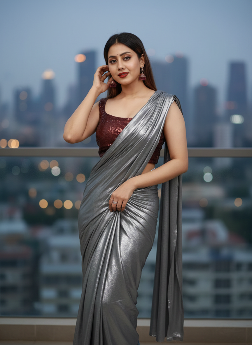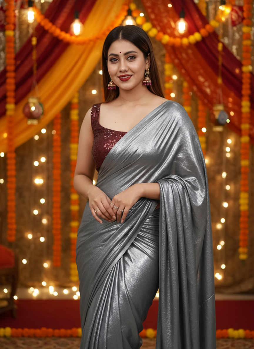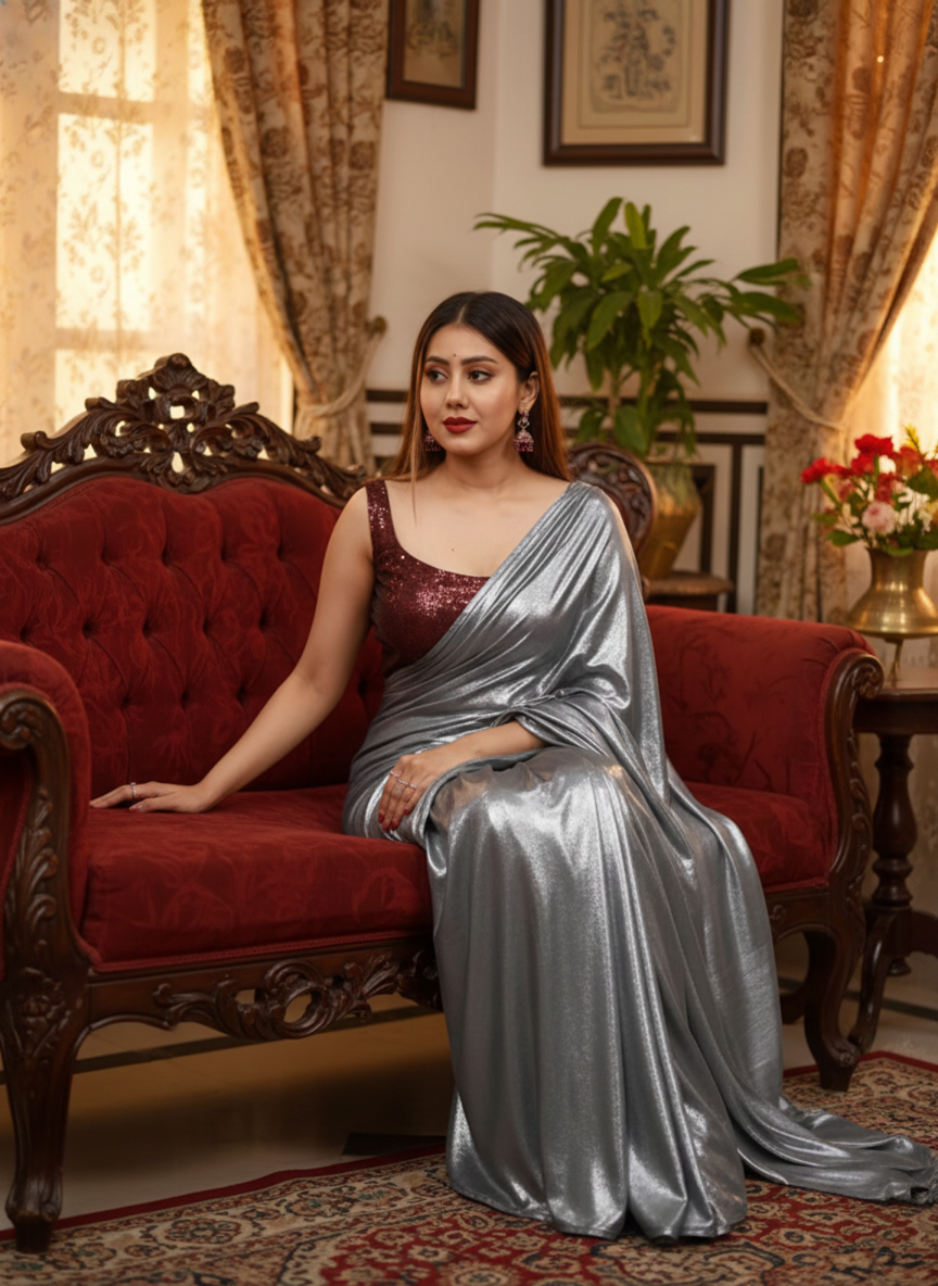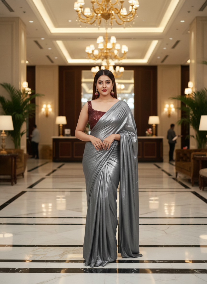 High-quality Metallic Lycra fabric se bani yeh saree lightweight, soft aur comfortable hai, jisse aap poore event ke dauran confident aur relaxed feel karti hain. Iske saath milne wala designer maroon sequin blouse overall look ko bold aur fashionable touch deta hai.
