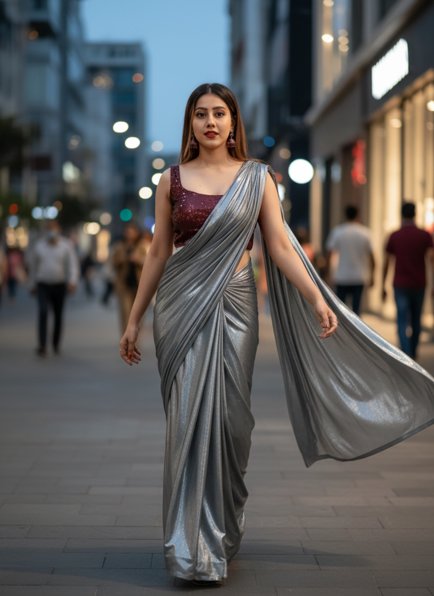 Modern glamour aur timeless elegance ka perfect combination. Yeh Premium Metallic Silver Saree un women ke liye design ki gayi hai jo apne look se statement banana chahti hain. Iski luxurious metallic shine, smooth drape aur classy finish aapko har special occasion par effortlessly elegant banati hai.